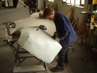 Enkel Dominik kommt und hilft gern. Hier schleift er die grundierte Motorhaube: