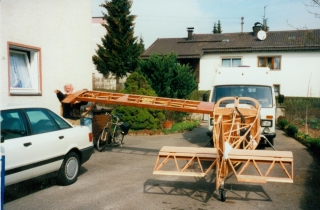 Ein freudiges Ereignis war es dann, als das Fahrwerk montiert war und der Rumpf "auf eigenen Beinen" in den Hof rollen konnte.